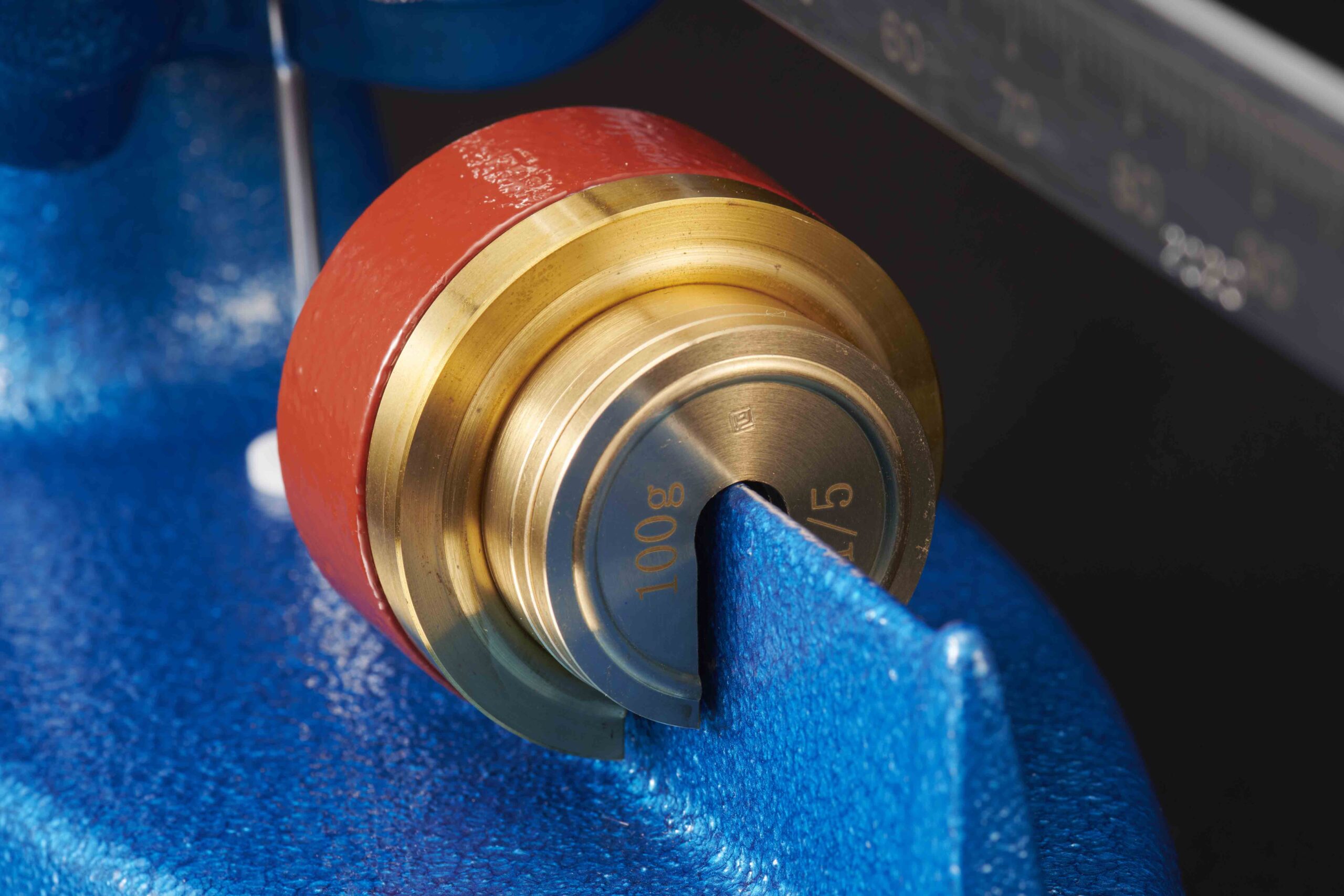 グッと拡大したことによって、細かく刻まれた目盛りがよく見え、まるで自分がはかりに乗っているような臨場感があります。全体を大きく拡大することで、精度の細かさを強調している粋な図案です。